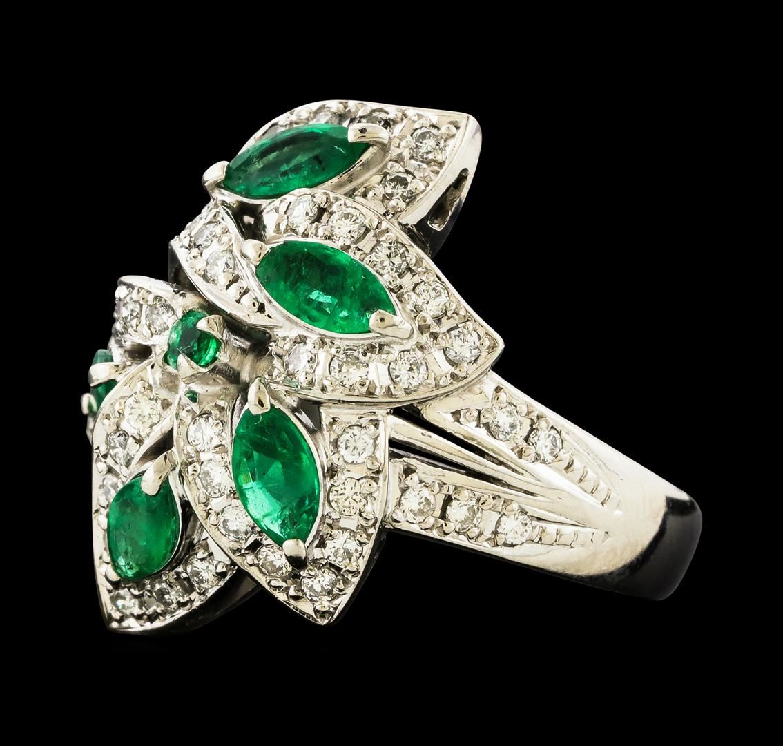 One ring featuring: Platinum containing Emerald with a total weight of 1.18ct and Diamonds with a total weight of 0.60ct. Total Weight of Ring: 14.6 grams.