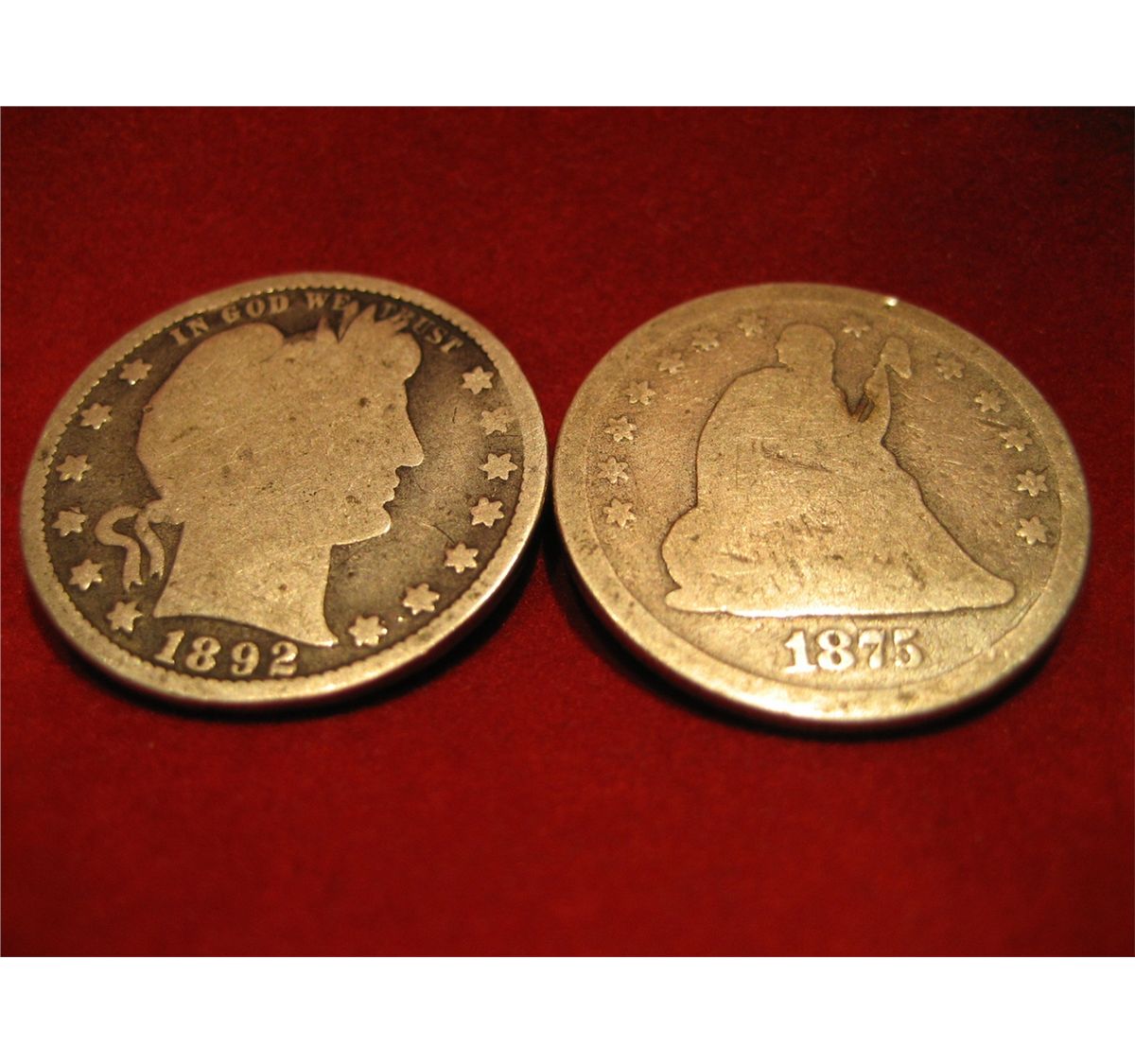 (2) (1) 1875 (1) 1892 BARBER AND SETED LIBERTY QUARTERS 90% SILVER