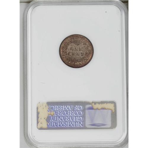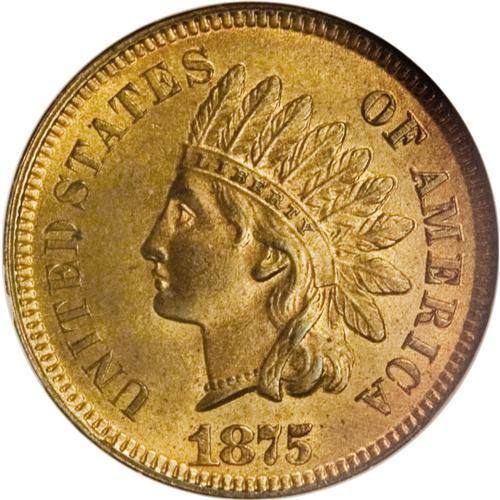<B>1/1875<1C> MS65 Red NGC.</B></I> Snow-2. Broad repunching visible at the top left of 1. "Rare." The coppery-gold surfaces exhibit sharply struck design elements; all four diamonds show, but the second from the top is weak on the right side. A minute identifying mark is noted beneath the second T of STATES, and a few minor flecks appear on each side. This coin has a very high degree of eye appeal. Certified in a prior generation holder. NGC has certified only seven Gems with the Red designation, and a mere four coins finer (9/06).