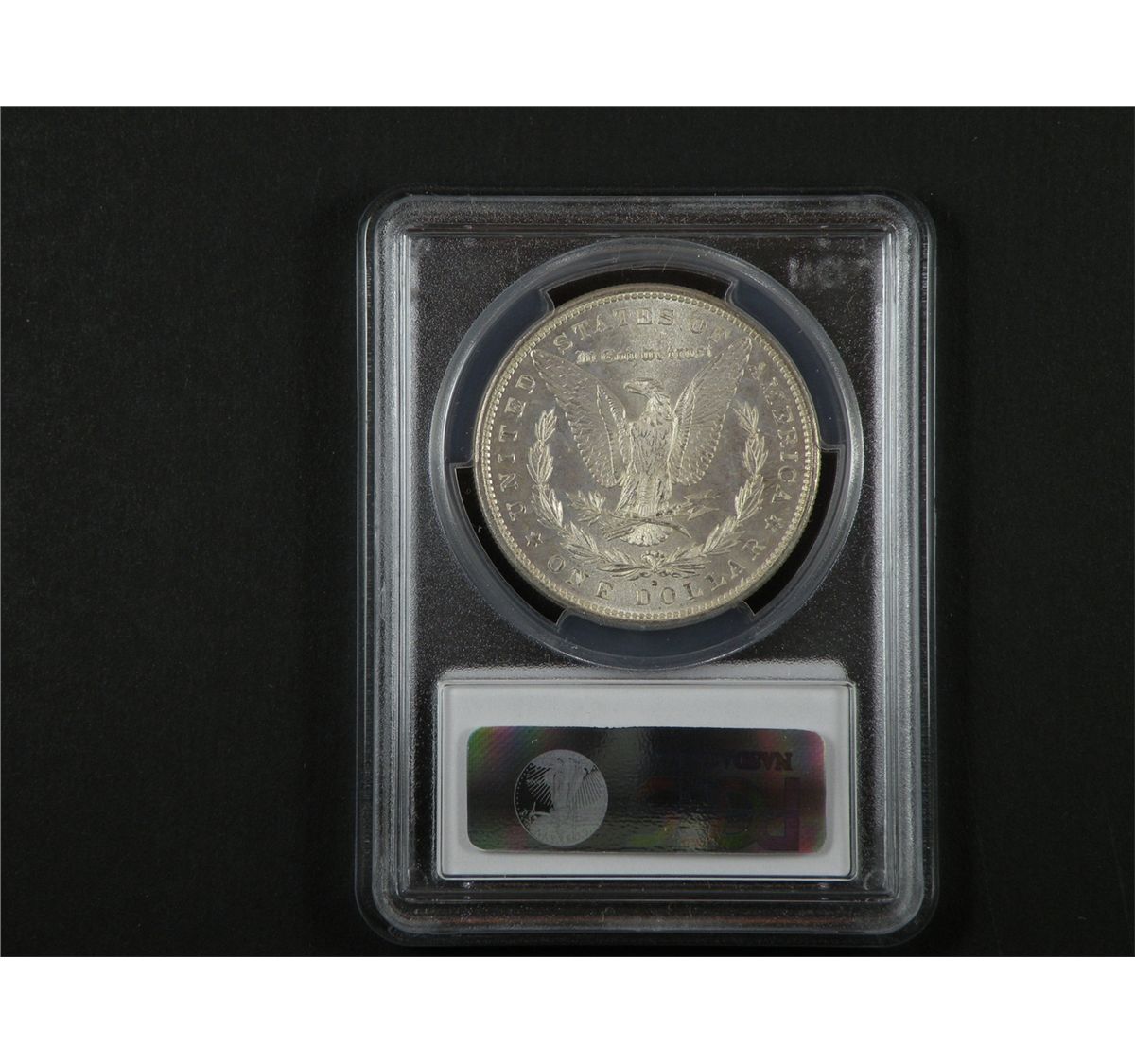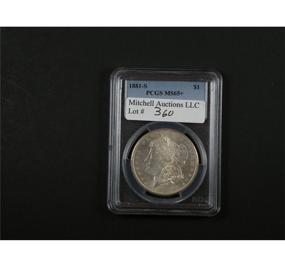 $1 1881-S PCGS MS65+. Smooth, sharp underlying surfaces are accented by a shade of pale golden toning on either side. Est.$150