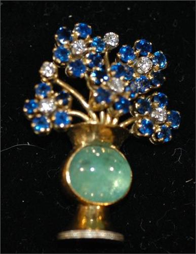 1 18K GOLD "FLOWER POT" BROACH, with sapphires and diamonds mid-20th century, packing and shipping $20