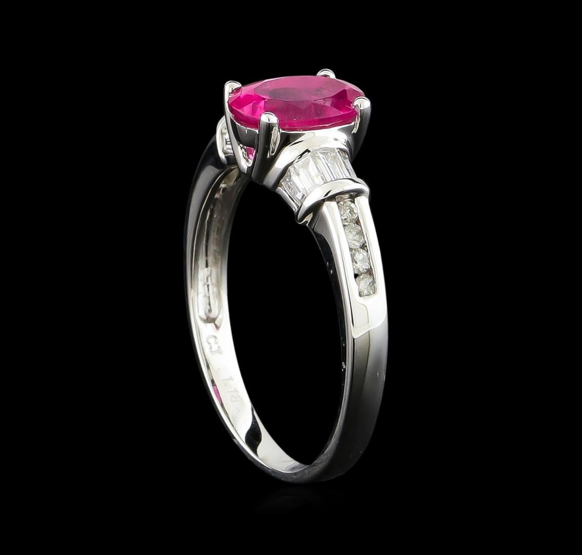 One electronically tested 14KT white gold ladies cast pink tourmaline and diamond ring with a bright polish finish. The featured pink tourmaline is supported by diamond set shoulders, completed by a two millimeter wide band. Trademark is CJ. Identified with markings of "14K". Condition is new, good workmanship. Containing: One prong set oval mixed cut natural pink tourmaline, measuring 7.95 x 5.90 x 3.80mm, approximate weight of 1.18ct., clarity is moderately included, type II, medium, moderately strong, slightly purplish red color, (GIA slpR 5/4), cut is good. Transmitting light somewhat diffusely, transparent to translucent. Naturally occurring internal & external characteristics are present. Graded in the setting. This color of tourmaline is commonly irradiated to improve or change the color. Whether or not this gemstone has been irradiated cannot currently be determined. Ten channel set baguette cut diamonds, measuring from 2.40 x 1.20 x 0.84mm (depth est.) to 2.50 x 1.30 x 0.91mm (depth est.) approximate total weight of 10 Stones = 0.25ct. Graded in the setting. Clarity: SI-2 to I-1. Color: G - H Eight channel set round brilliant cut diamonds, measuring 1.50 - 1.40 x 0.87mm (depth est.) approximate total weight of 8 Stones = 0.12ct. Graded in the setting. Clarity: I-2 to I-3. Color: G - H. Total Weight of Colored Stones 1.18ct. Total Weight of Diamonds 0.37ct. Total Weight of Ring 2.82gm. AIG Appraised at $1,665.00.