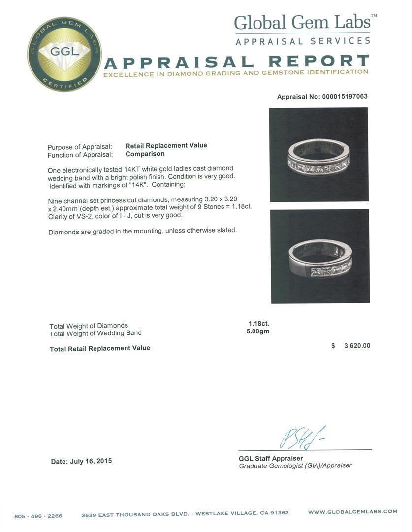 One electronically tested 14KT white gold ladies cast diamond wedding band with a bright polish finish. Identified with markings of "14K". Condition is very good. Containing: Nine channel set princess cut diamonds, measuring 3.20 x 3.20 x 2.40mm (depth est.) approximate total weight of 9 Stones = 1.18ct. Clarity: VS-2. Color: I - J, Cut is Very Good. Diamonds are graded in the mounting, unless otherwise stated. Total Weight of Diamonds 1.18ct. Total Weight of Wedding Band 5.00 grams. GGL Appraised at $3,620.00.
