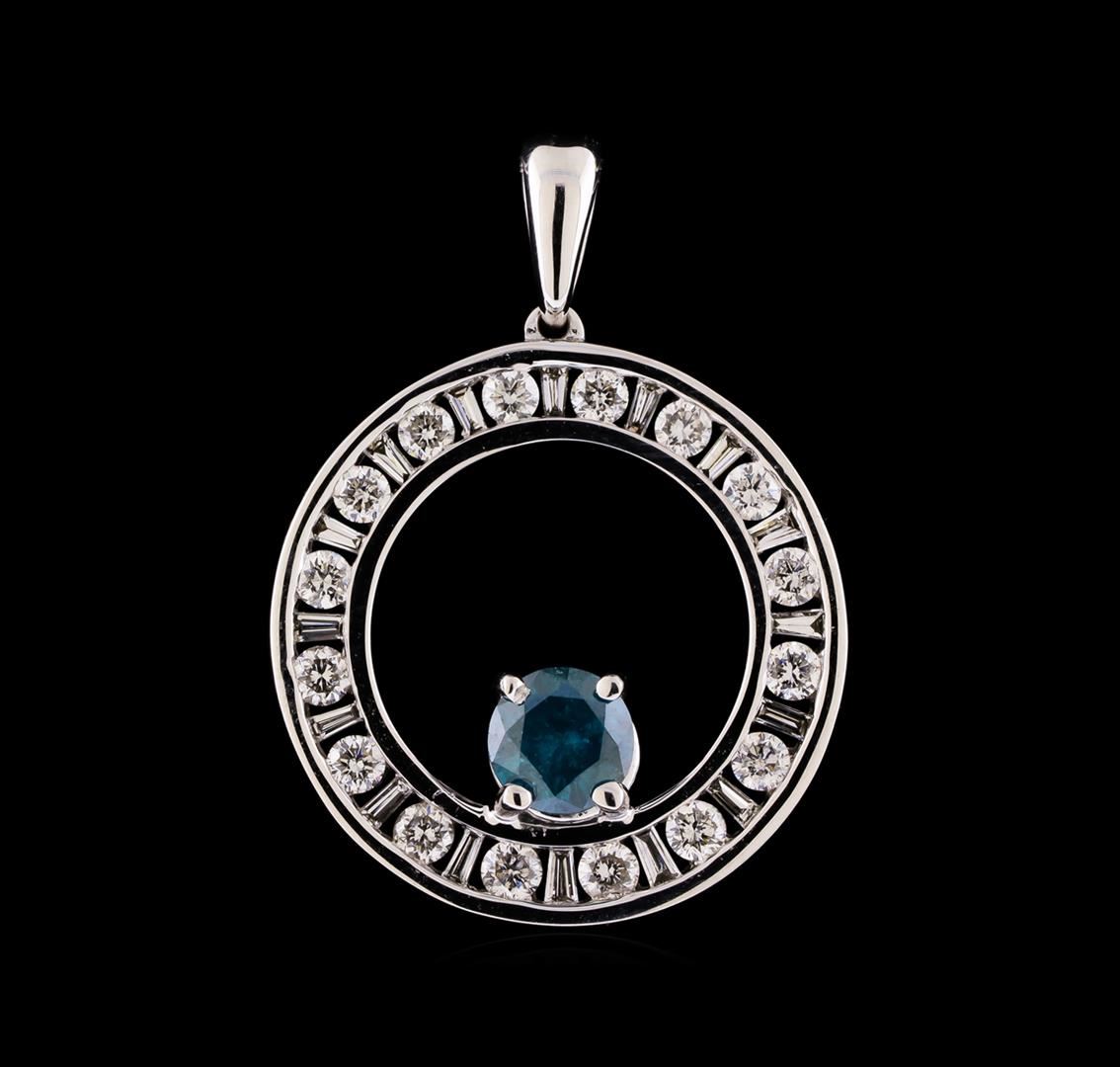 One pendant with chain: 14KT white gold weighing 3.15gm containing a blue diamond with a total weight of 0.54ct and side diamonds weighing 0.65ctw.