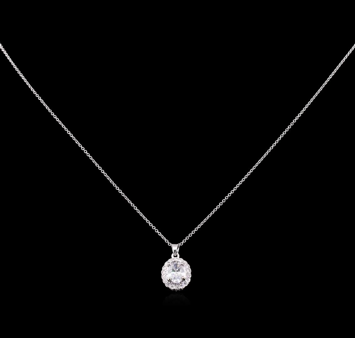 One electronically tested 14KT white gold lady's combination cast & assembled fashion pendant & chain 18.0" long, 1mm round cable link with a spring ring clasp with a scalloped halo with a bright polish with milgrain detailing finish. Identified with markings of "14K". Condition is new, good workmanship. Containing: One prong set oval shaped cut diamond, measuring 7.96 x 5.40 x 3.60mm (depth est.) approximate weight of 1.01ct. Graded in the setting. Clarity: I-1. Color: I. Cut Good Eighteen prong set round brilliant cut diamonds, measuring 1.40 - 1.35 x 0.87mm (depth est.) approximate total weight of 18 Stones = 0.18ct. Graded in the setting. Clarity: SI-1 to I-1. Color: H - I. Cut Good. Total Weight of Diamonds 1.19ct. Total Weight of Pendant & Chain 2.80gm. GAS Appraised at $7,990.00.