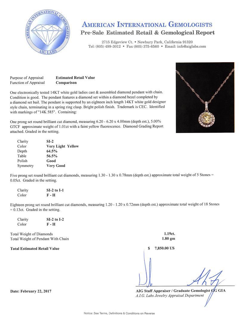 One electronically tested 14KT white gold ladies cast & assembled diamond pendant with chain. The pendant features a diamond set within a diamond bezel completed by a diamond set bail. The pendant is supported by an eighteen inch length 14KT white gold designer style chain, terminating in a spring ring clasp. Bright polish finish. Trademark is CEC. Identified with markings of '14K 585'. Condition is good. Containing: One prong set round brilliant cut diamond, measuring 6.20 - 6.20 x 4.00mm (depth est.), 5.00.%. GTCF approximate weight of 1.01ct with a faint yellow fluorescence. Diamond Grading Report attached. Graded in the setting. Clarity SI-2. Depth: 64.5%. Table: 56.5%. Five prong set round brilliant cut diamonds, measuring 1.30 - 1.30 x 0.78mm (depth est.) approximate total weight of 5 Stones = 0.05ct. Graded in the setting. Clarity SI-2 to I-1. Color: F - H Eighteen prong set round brilliant cut diamonds, measuring 1.20 - 1.20 x 0.72mm (depth est.) approximate total weight of 18 Stones = 0.13ct. Graded in the setting. Clarity SI-2 to I-2. Color: F - H. Total Weight of Diamonds 1.19ct.. Total Weight of Pendant With Chain 1.80gm. AIG Appraised at $7,850.00.