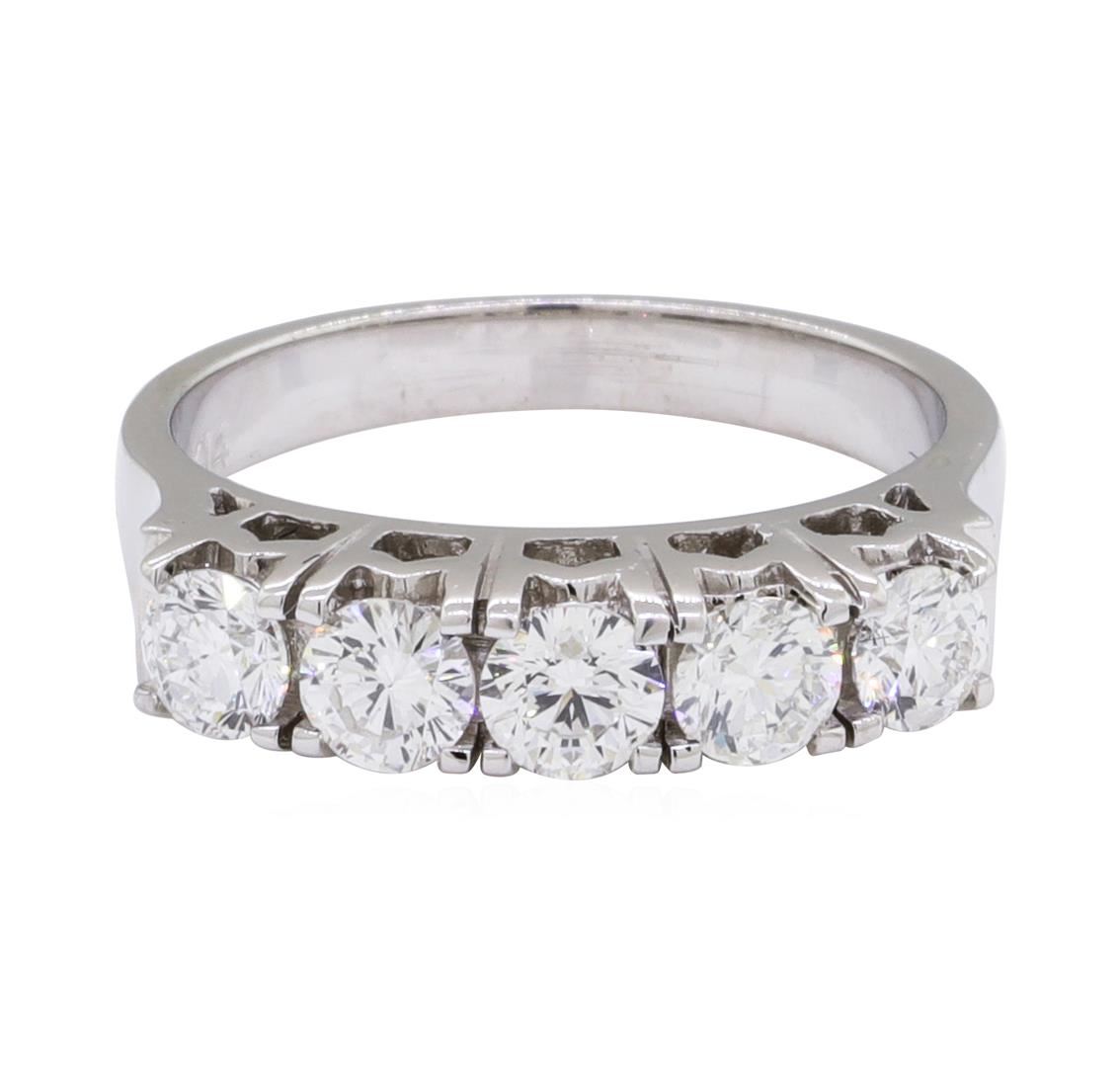 One electronically tested 14KT white gold lady's cast wedding ring with a five stone motif with a bright polish finish. This featured lady's ring has a shank measuring 2.65 millimeters in width. Identified with markings of 'K14'. Condition is new, good workmanship. Containing: Five prong set round brilliant cut diamonds, measuring 4.00 - 3.70 x 2.39mm (depth est.) approximate total weight of 5 Stones = 1.19ct. Graded in the setting. Color H - I Clarity SI-1 to I-1 Cut Very Good. Total Weight of Diamonds 1.19ct.. Total Weight of Ring 4.20gm GAS Appraised at $3850.00. GAS Appraised.