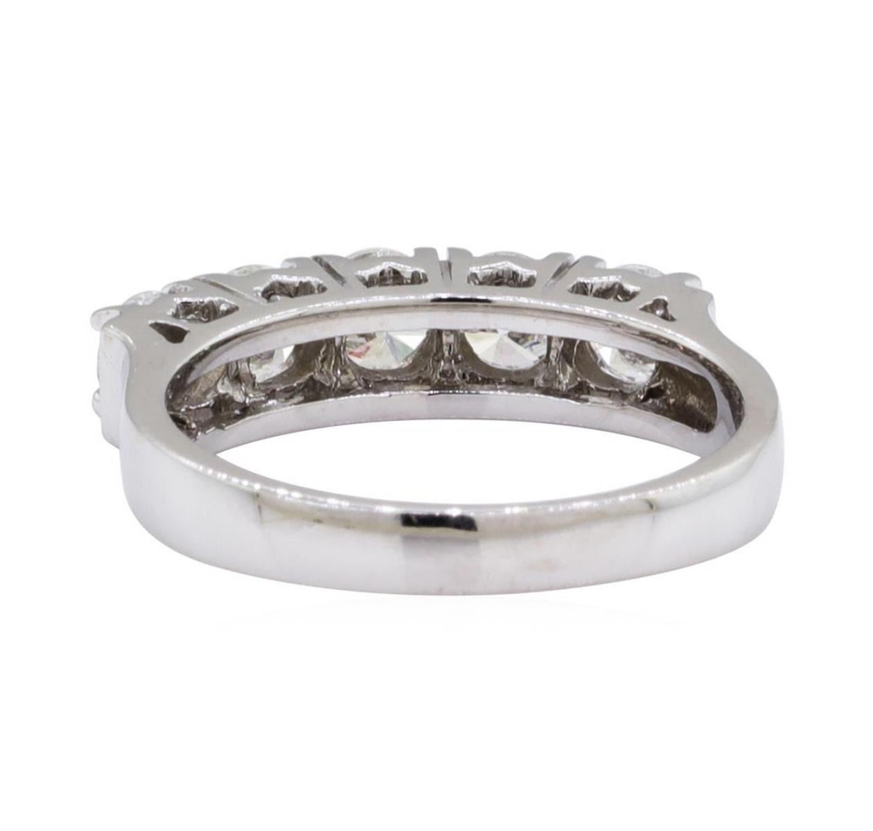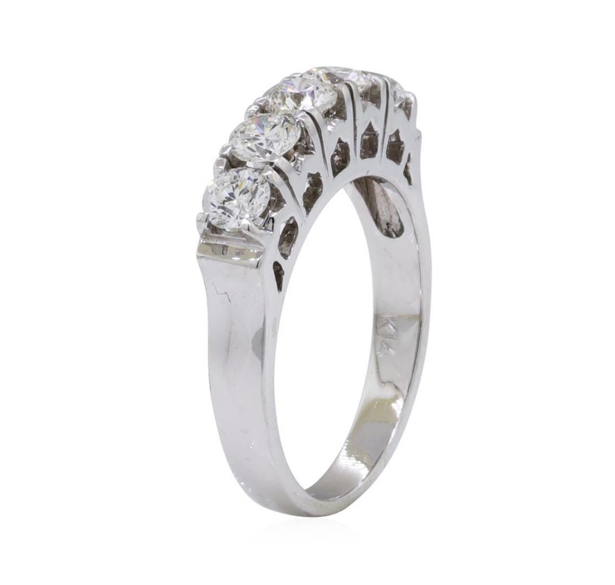 One electronically tested 14KT white gold lady's cast wedding ring with a five stone motif with a bright polish finish. This featured lady's ring has a shank measuring 2.65 millimeters in width. Identified with markings of 'K14'. Condition is new, good workmanship. Containing: Five prong set round brilliant cut diamonds, measuring 4.00 - 3.70 x 2.39mm (depth est.) approximate total weight of 5 Stones = 1.19ct. Graded in the setting. Color H - I Clarity SI-1 to I-1 Cut Very Good. Total Weight of Diamonds 1.19ct.. Total Weight of Ring 4.20gm GAS Appraised at $3850.00. GAS Appraised.