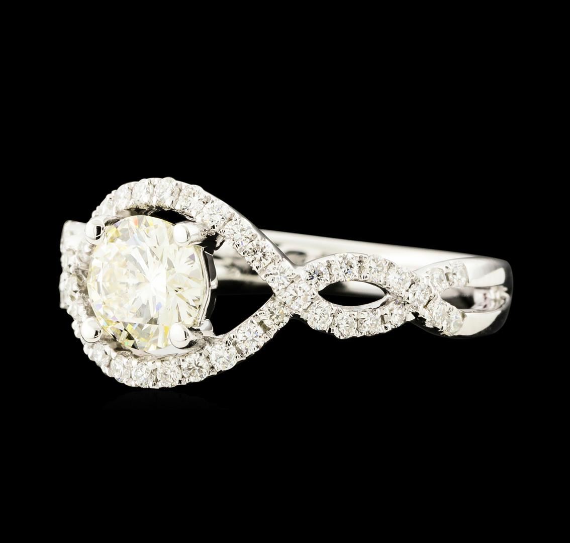 One electronically tested 18KT white gold lady's cast wedding ring with a split crossover shank with a bright polish finish. The featured lady's ring has a shank measuring 2.50 millimeters wide. Identified with markings of '18K 750'. Condition is new, good workmanship. Containing: One prong set round brilliant cut diamond, measuring 6.05 - 6.03 x 3.41mm (depth est.) approximate weight of 0.78ct. Graded in the setting. Clarity VS-2. Color: K - L Cut Good Fifty prong set round brilliant cut diamonds, measuring 1.30 - 1.25 x 0.79mm (depth est.) approximate total weight of 50 Stones = 0.41ct. Graded in the setting. Clarity SI-1 to SI-2. Color: G - H Cut Very Good. Total Weight of Diamonds 1.19ct.. Total Weight of Ring 4.70gm. GAS Appraised at $7,640.00.