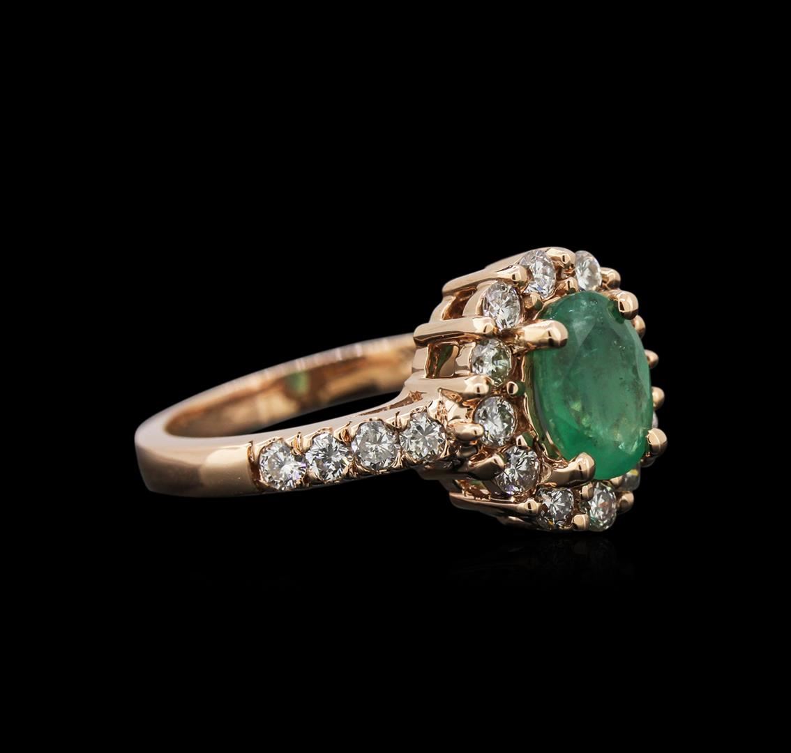 One ring featuring: 14KT rose gold weighing 5.60 grams containing one prong set oval shape emerald center stone with a total weight of 1.19ct and 20 prong set round diamonds with a total weight of 0.82ct.