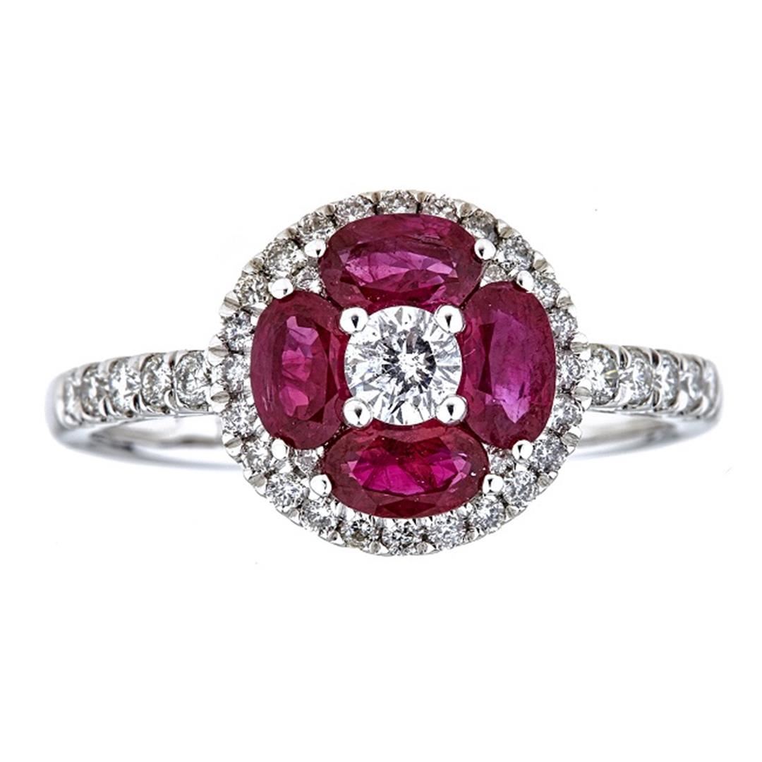One Ruby and Diamond Ring featuring: 18KT White Gold with a total weight of 3.00 grams, Four Ruby Stones with a total weight of 1.19ctw, One Round Cut Diamond with a total weight of 0.17ct, and 38 Round Cut Diamonds with a total weight of 0.36ctw.