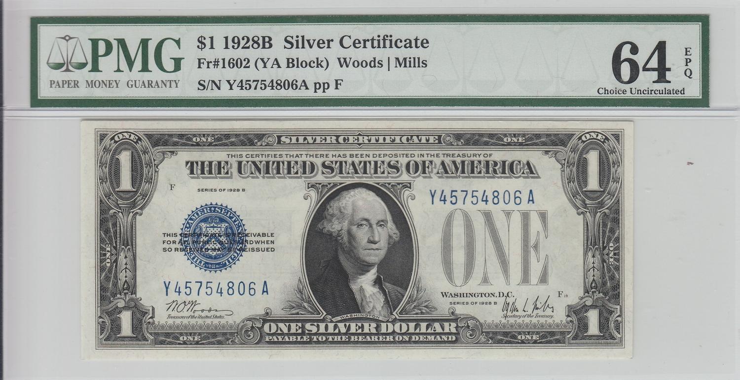 $1 1928-B SILVER CERTIFICATE TOUGH YA BLOCK PMG 64 EPQ