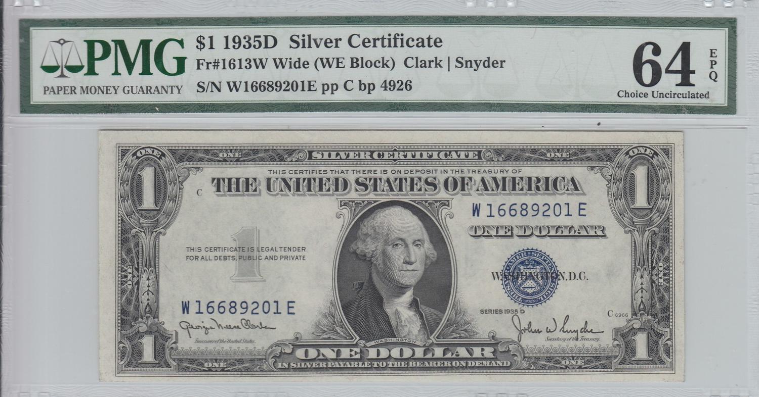 $1 1935 d SILVER CERTIFICATE PMG EPQ 64
