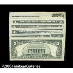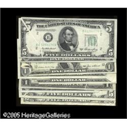 <B>$1 1935E Silver gutter fold <B>VF,</B></I> $5 1950A FRN three small to large gutter folds <B>Fine-VF,</B></I> $1 1969D FRN butterfly with printed foldover <B>Extremely Fine,</B></I> $1 1974 FRN neat foldover with sheet number <B>AU,</B></I> $5 1977A FRN diagonal gutter fold <B>Extremely Fine,</B></I> $1 1985 FRN accordion tear <B>AU,</B></I> $1 1988 FRN accordion foldover obstruction with inked teller graffiti <B>AU,</B></I> $5 1988A FRN butterfly fold <B>VF,</B></I> $1 1995 FRN large butterfly fold <B>Extremely Fine</B></I>. 9 notes Lot:15684