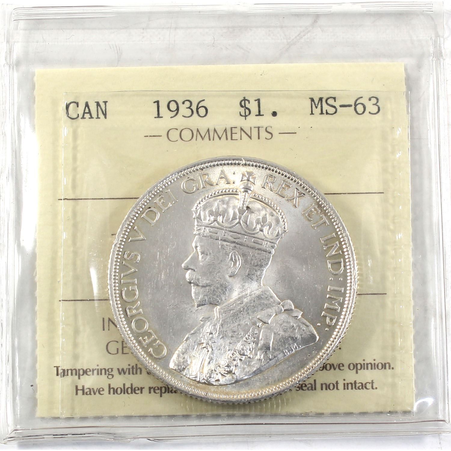 $1 1936 ICCS Certified MS-63. Attractive Mint state coin.