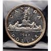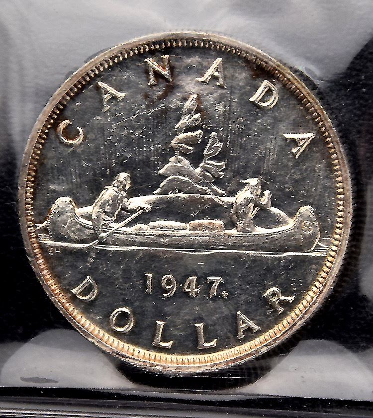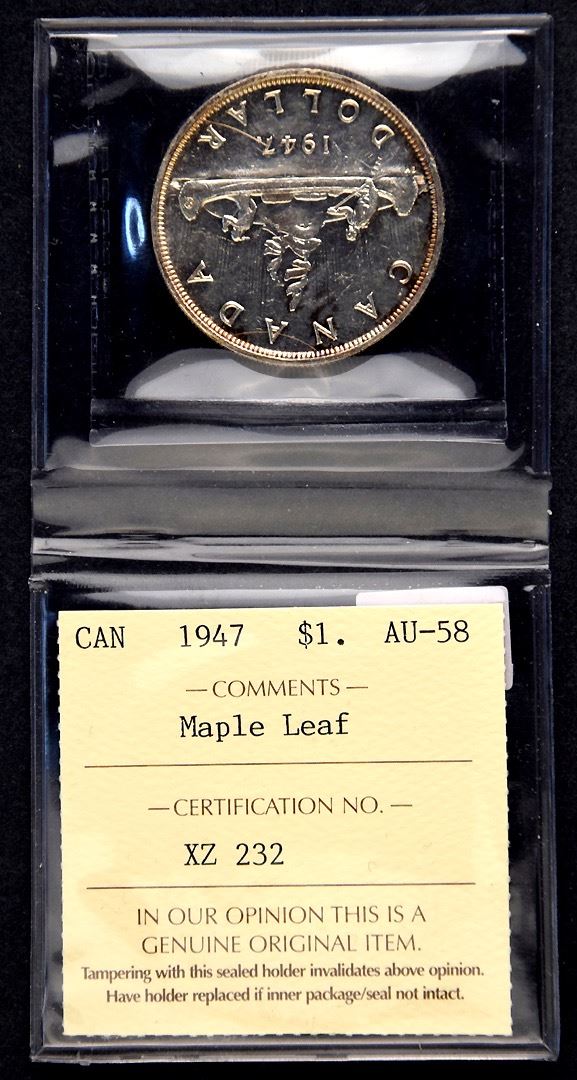 Canada $1, 1947 ML, certified ICCS AU-58. Deep strike, nice surfaces, undipped white, with hints of peripheral toning.
