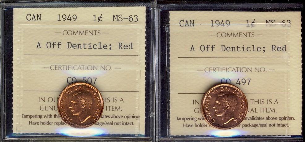 1¢ 1949 A Off Dent ICCS MS63RD. Lot of two coins both full red.
