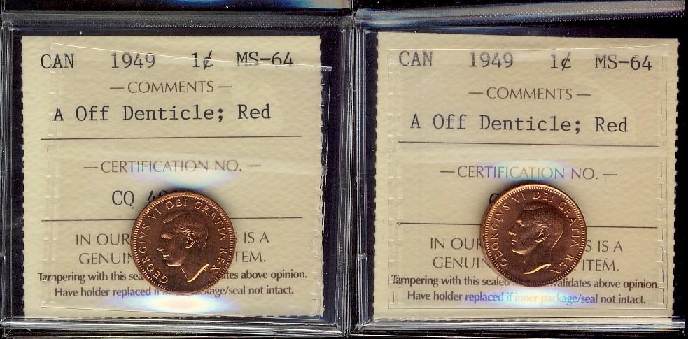 1¢ 1949 A Off Dent ICCS MS64RD. Lot of two coins both full