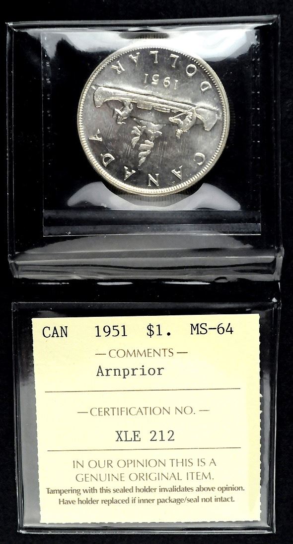 Canada $1, 1951 "Arnprior", certified ICCS MS-64, full white, sharp strike, conservatively graded.