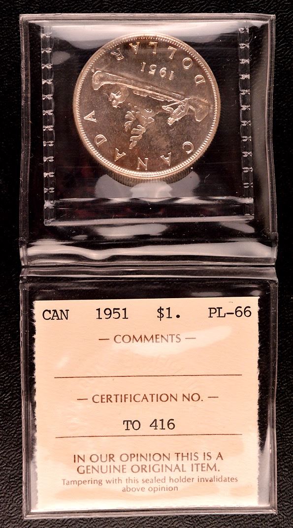 Canada $1, 1951. Lot of 4 coins : 3 x ICCS PL-64, 1 x ICCS PL-66. All fully brilliant, attractive coins.