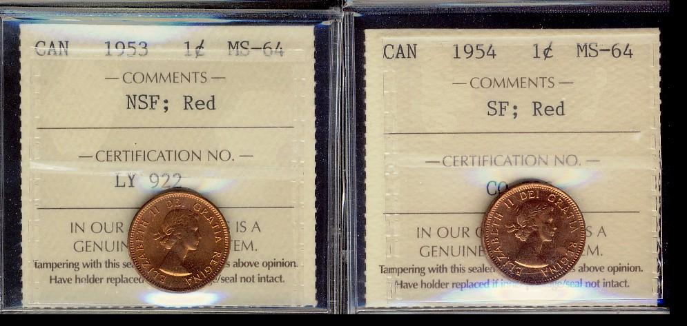 1¢ 1953 NSF, 1954 SF ICCS MS64. Lof of two coins both full red.