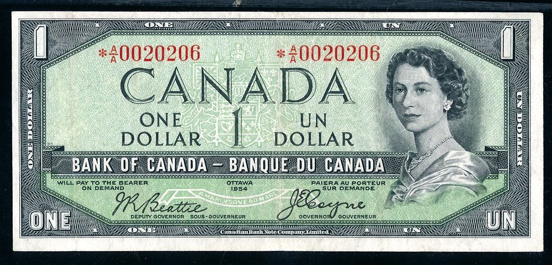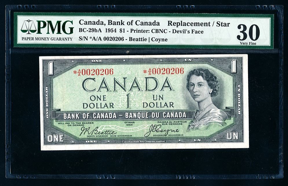 Bank of Canada, One Dollar, 1954 Beattie - Coyne, BC-29bA, The rare "Devil's Face -Asterisk" note graded PMG VF-30. S/N : *A/A 0020206.