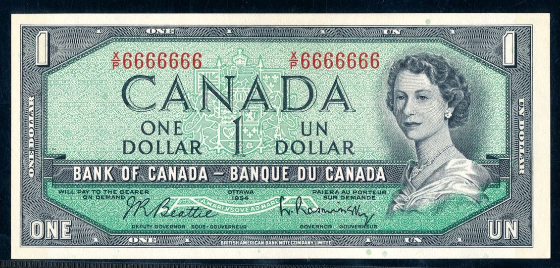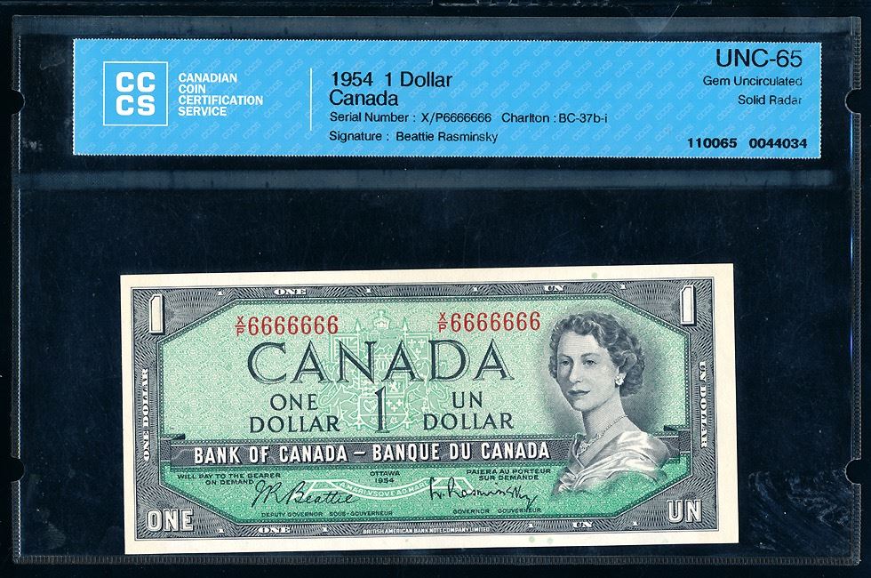 Bank of Canada, One Dollar, 1954 Beattie - Rasminsky, BC-37b-i, Solid Number # X/P 6666666 graded CCCS Unc-65