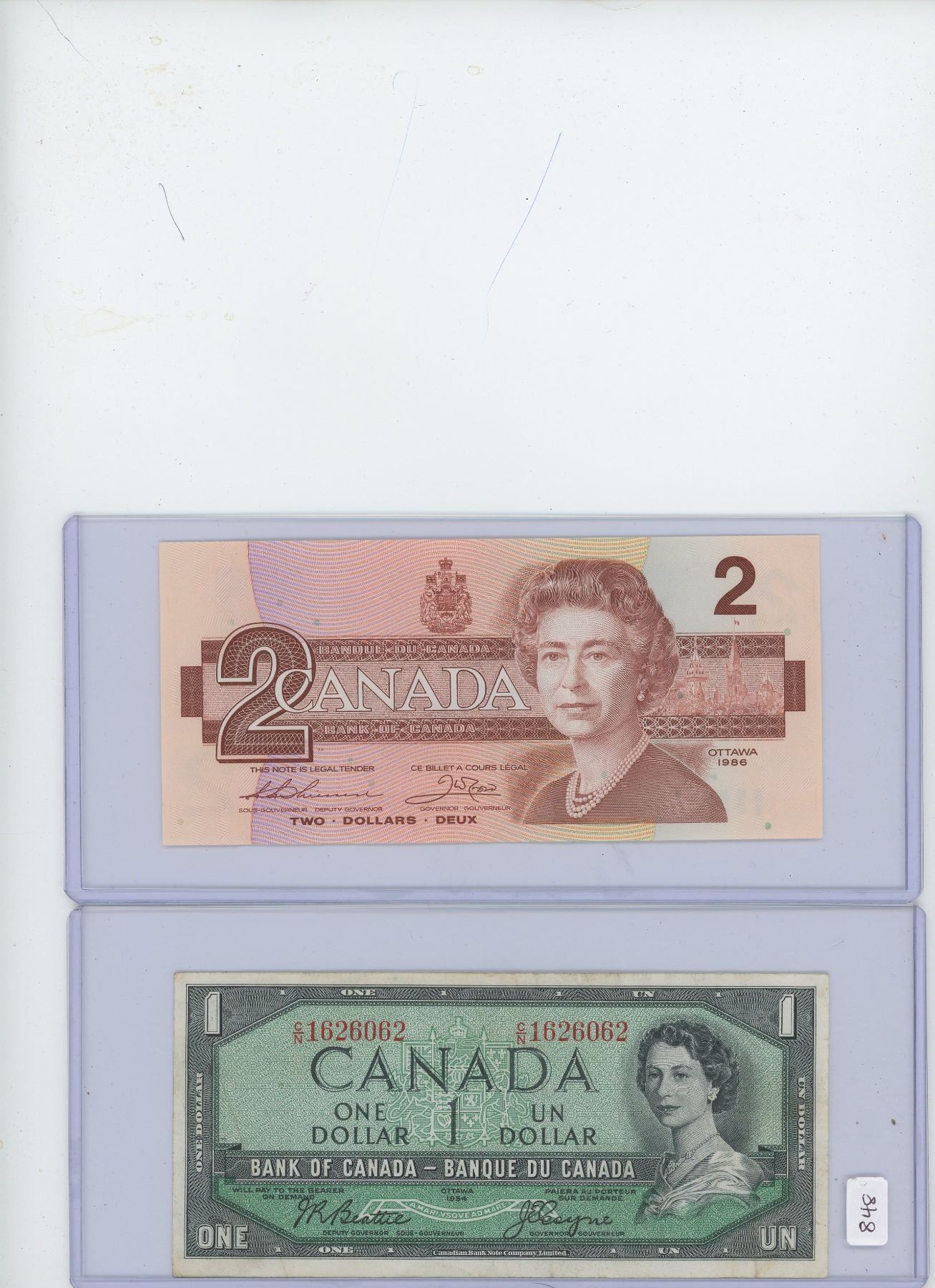1-1954 Canadian $1 Bill & 1-1986 Canadian $2 Bill