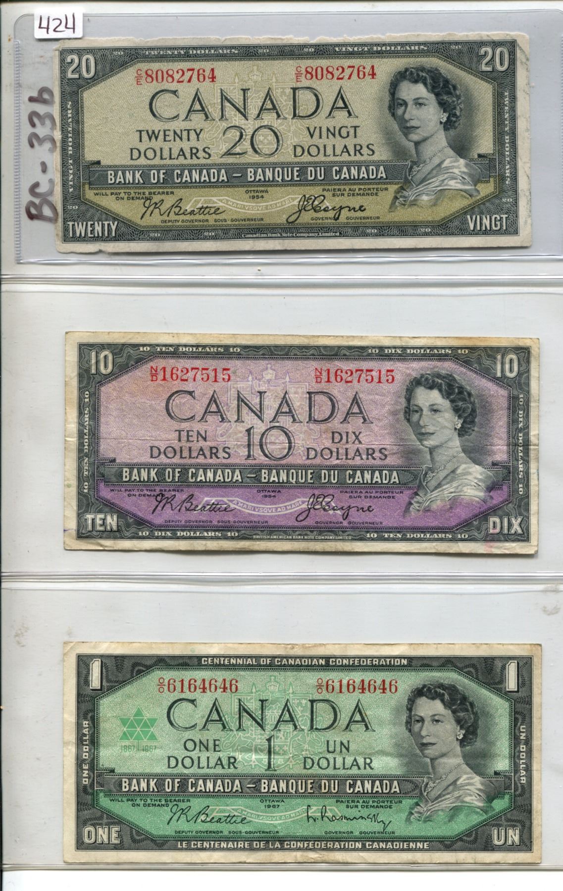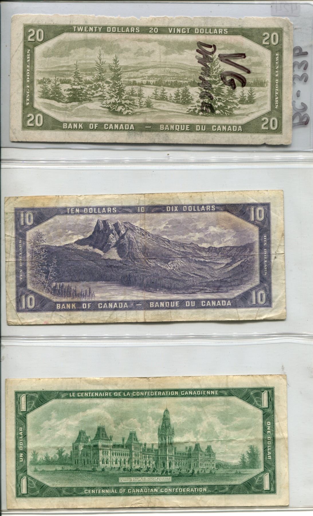 1-1954 Devils face 20 dollar bill, 1-1954 mp 10 dollar bill, 1-1967 one dollar bill ($31.00 face),3-Canadian bills
