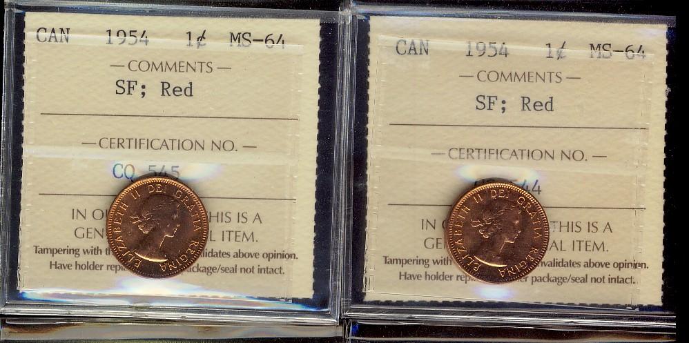 1¢ 1954 SF ICCS MS64RD. Lot of 2 coins both full red.