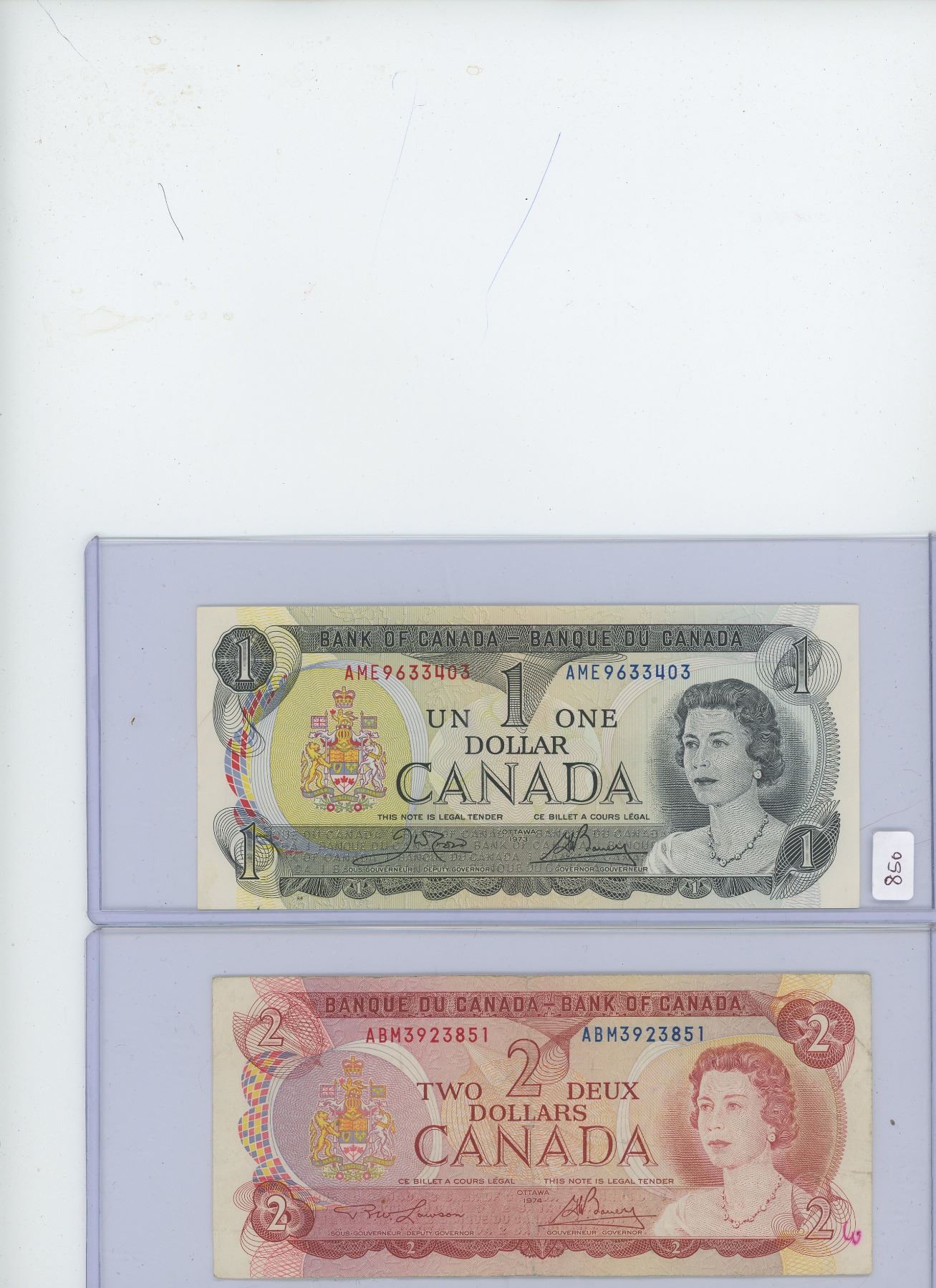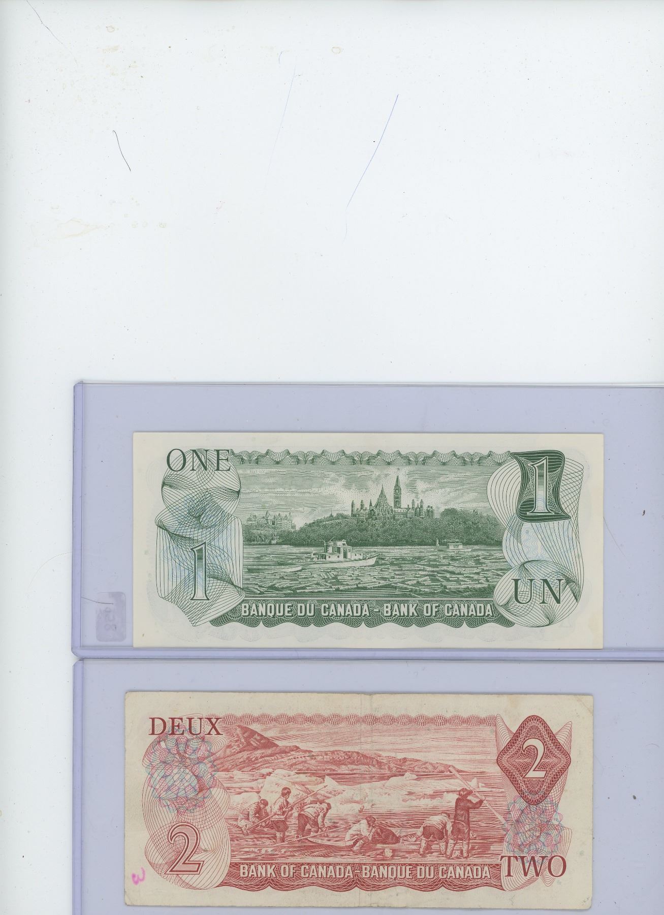 1-1973 Canadian $1 Bill & 1-1974 Canadian $2 Bill