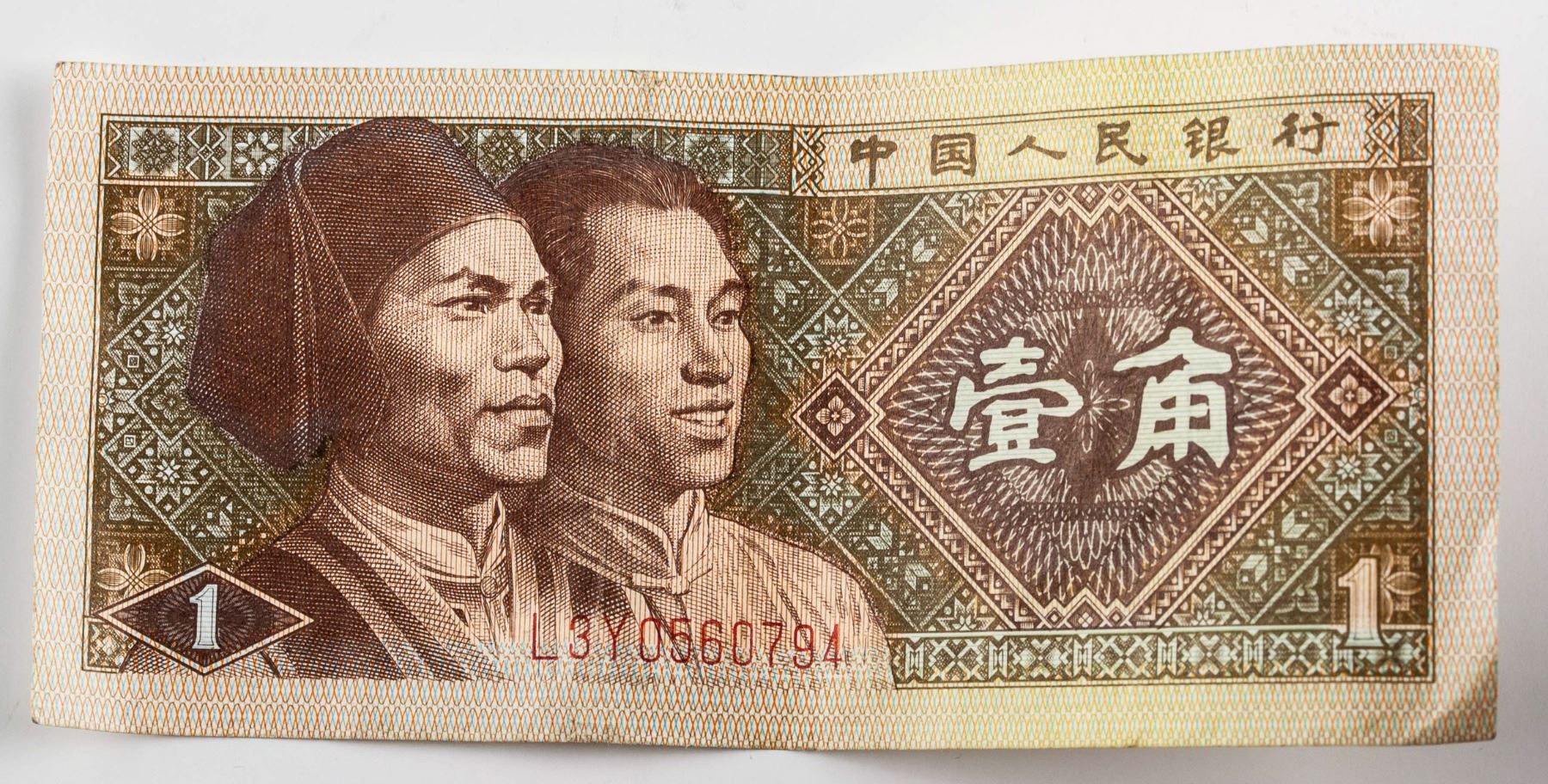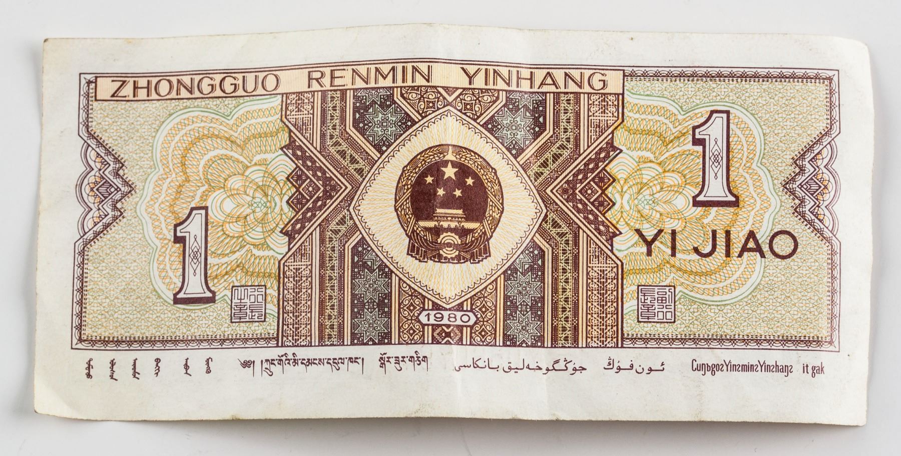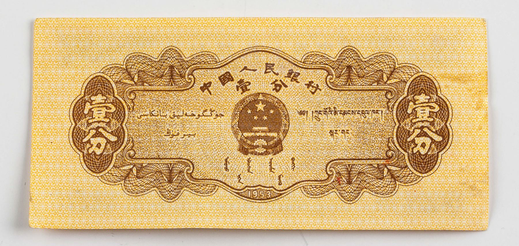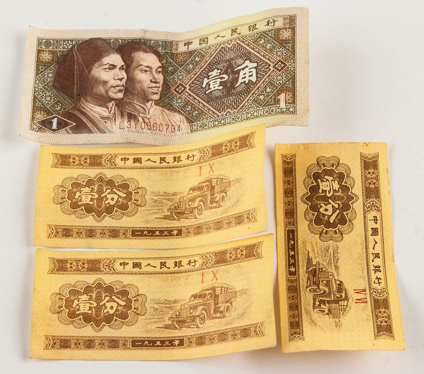Four (4) assorted Chinese banknote; of 1 1980 10 Cents banknote; 3 1953 1 Cent banknote; 4.2 mm - 5.2 mm x 8.97 mm - 11.35 mm 1.558 grams total
