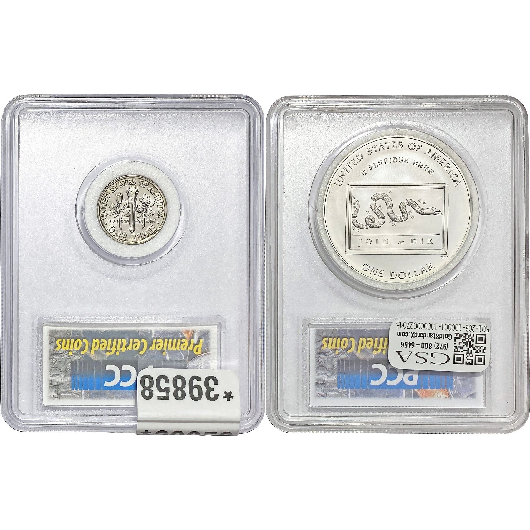 COINS AND CURRENCY LISTED IN GSA’S CATALOG AS GRADED AND ENCAPSULATED BY PCGS, NGC, ANACS, ICG, PCGS CURRENCY, PMG, PCGS BANKNOTE GRADING, CMC OR ANY OTHER THIRD-PARTY GRADING SERVICE ARE LIKEWISE SOLD “AS-IS” EXCEPT AS EXPRESSLY SET FORTH HEREIN. ALL THIRD-PARTY GRADING SERVICE GUARANTEES, INCLUDING AUTHENTICITY, ARE THE SOLE RESPONSIBILITY OF THE THIRD-PARTY GRADING SERVICE AND NOT WARRANTIES OR GUARANTEES OF GSA. BIDDERS SHOULD CONTACT THESE THIRD-PARTY GRADING SERVICES DIRECTLY WITH RESPECT TO ANY CLAIMS OR QUESTIONS THEY MAY HAVE CONCERNING THEIR GUARANTEES AND WARRANTIES. BIDDERS ACKNOWLEDGE AND AGREE THAT AUCTIONEER IS NOT BOUND BY OR LIABLE FOR ANY OPINION OR CERTIFICATION BY ANY THIRD-PARTY GRADING SERVICE. REMOVAL OF A PRODUCT FROM ITS PROTECTIVE CASING OR HOLDER OR ALTERATION OF ANY COIN HOLDER WAIVES ALL RIGHTS CONCERNING THE PRODUCT CONTAINED THEREIN.