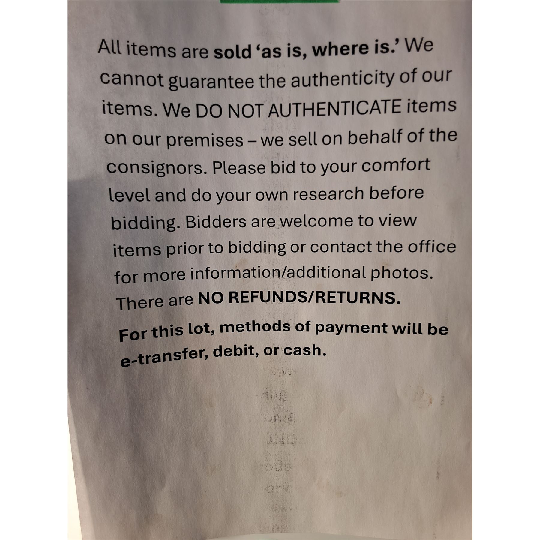 If you are wanting to hold on items for another auction coming up, let us know within 24 hours (maximum hold: 2 auctions). Please give 15 to 30 days for items to be collected, packed, payment processed and shipped out.