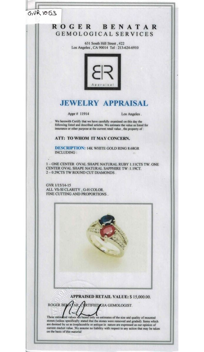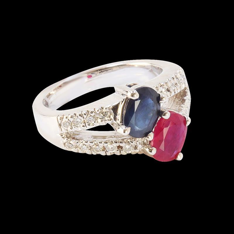 14K WHITE GOLD NATURAL SAPPHIRE RING:8.68 GRAMS/DIAMOND:0.29CT/BLUE SAPPHIRE:1.19CT/RUBY:1.11CT/#GVR1053/ NO Lead or Glass Filling