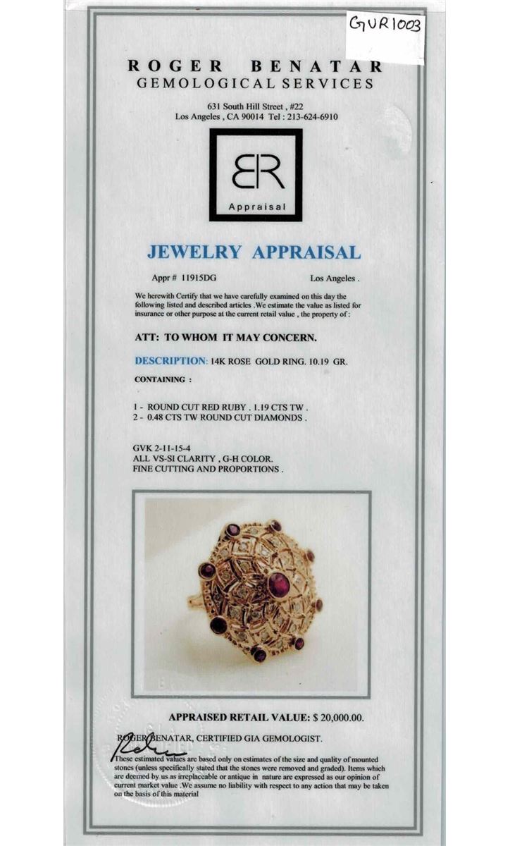 14K ROSE GOLD NATURAL RUBY RING:10.19 GRAMS/DIAMOND:0.48CT/RUBY:1.19CT/#GVR1003/ NO LEAD OR GLASS FILLING