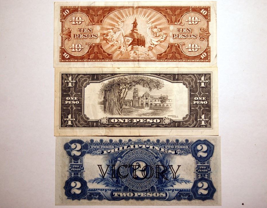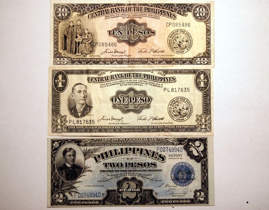 1, 2, 10 peso notes from Philippines. 1 peso 1949, 2 peso 1922, 10 peso 1949