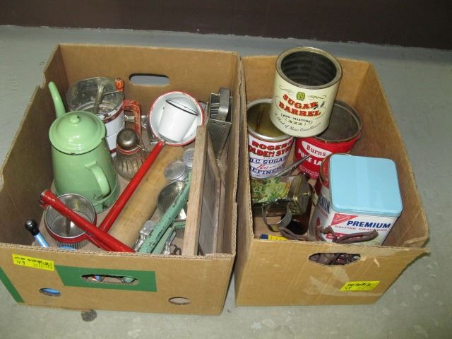 1 2 BOXES OF ASSORTED KITCHEN PRESSES, FLOUR SIFTER, FOOD TINS ETC