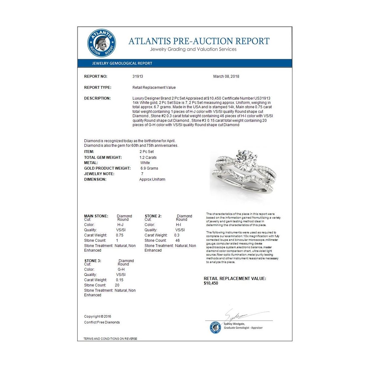 REF-211K3W -31913 ---- 1.2 CTW Certified VS/SI Diamond Solitaire 2Pc Wedding Set 14K White Gold ---- Luxury Designer Brand 2 Pc Set Appraised at $10,450 Certificate Number US31913 14k White gold, 2 Pc Set Size is 7, 2 Pc Set measuring approx. Uniform, weighing in total approx. 6.7 grams. Made in the USA and is stamped 14k, Main stone 0.75 carat total weight containing 1 pieces of H-J color with VS/SI quality Round shape cut Diamond , Stone #2 0.3 carat total weight containing 46 pieces of H-I color with VS/SI quality Round shape cut Diamond , Stone #3 0.15 carat total weight containing 20 pieces of G-H color with VS/SI quality Round shape cut Diamond