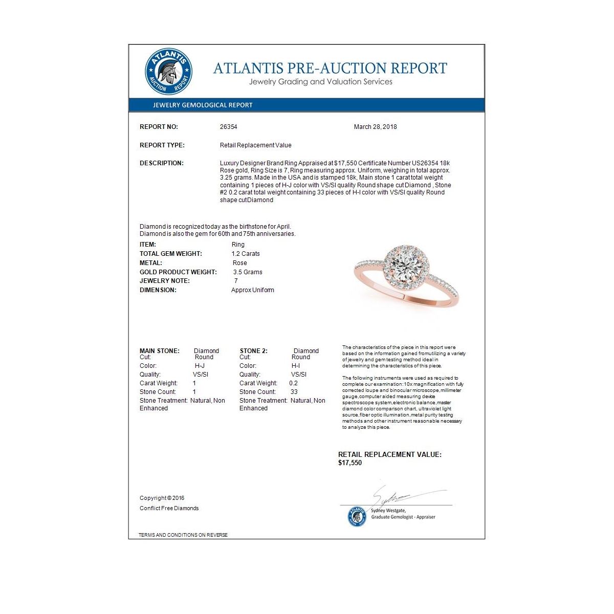 REF-354M2H -26354 ---- 1.2 CTW Certified VS/SI Diamond Solitaire Halo Ring 18K Rose Gold ---- Luxury Designer Brand Ring Appraised at $17,550 Certificate Number US26354 18k Rose gold, Ring Size is 7, Ring measuring approx. Uniform, weighing in total approx. 3.25 grams. Made in the USA and is stamped 18k, Main stone 1 carat total weight containing 1 pieces of H-J color with VS/SI quality Round shape cut Diamond , Stone #2 0.2 carat total weight containing 33 pieces of H-I color with VS/SI quality Round shape cut Diamond