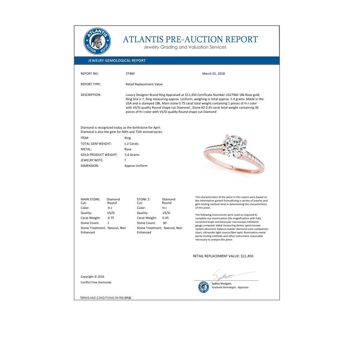 REF-208M2H -27460 ---- 1.2 CTW Certified VS/SI Diamond Solitaire Ring 18K Rose Gold ---- Luxury Designer Brand Ring Appraised at $11,450 Certificate Number US27460 18k Rose gold, Ring Size is 7, Ring measuring approx. Uniform, weighing in total approx. 5.4 grams. Made in the USA and is stamped 18k, Main stone 0.75 carat total weight containing 1 pieces of H-J color with VS/SI quality Round shape cut Diamond , Stone #2 0.45 carat total weight containing 30 pieces of H-I color with VS/SI quality Round shape cut Diamond