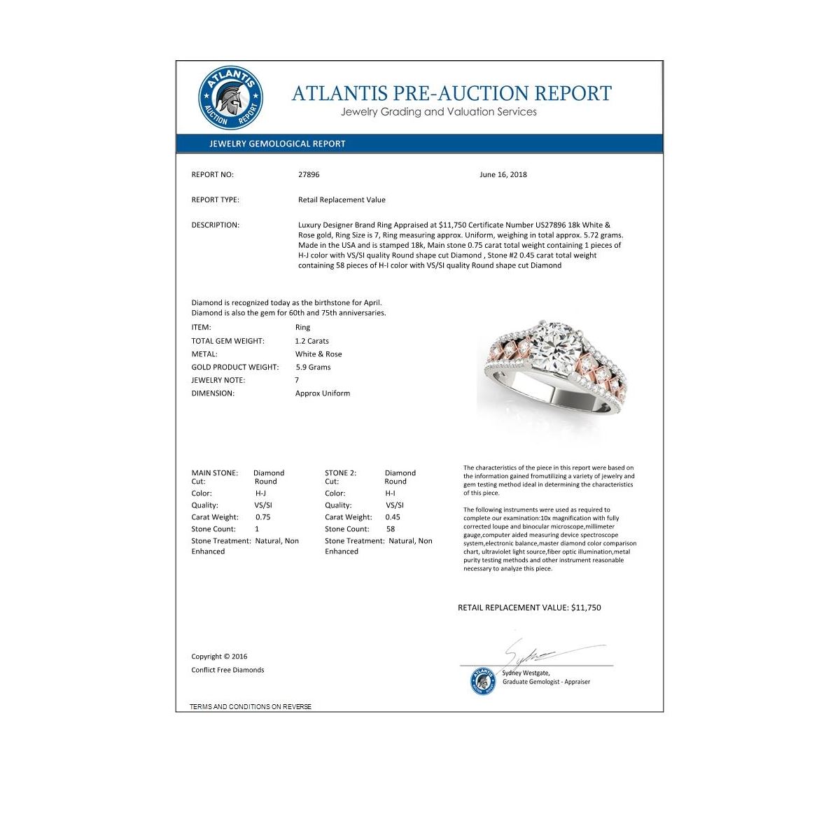 REF-213Y6K -27896 ---- 1.2 CTW Certified VS/SI Diamond Solitaire Ring 18K White & Rose Gold ---- Luxury Designer Brand Ring Appraised at $11,750 Certificate Number US27896 18k White & Rose gold, Ring Size is 7, Ring measuring approx. Uniform, weighing in total approx. 5.72 grams. Made in the USA and is stamped 18k, Main stone 0.75 carat total weight containing 1 pieces of H-J color with VS/SI quality Round shape cut Diamond , Stone #2 0.45 carat total weight containing 58 pieces of H-I color with VS/SI quality Round shape cut Diamond