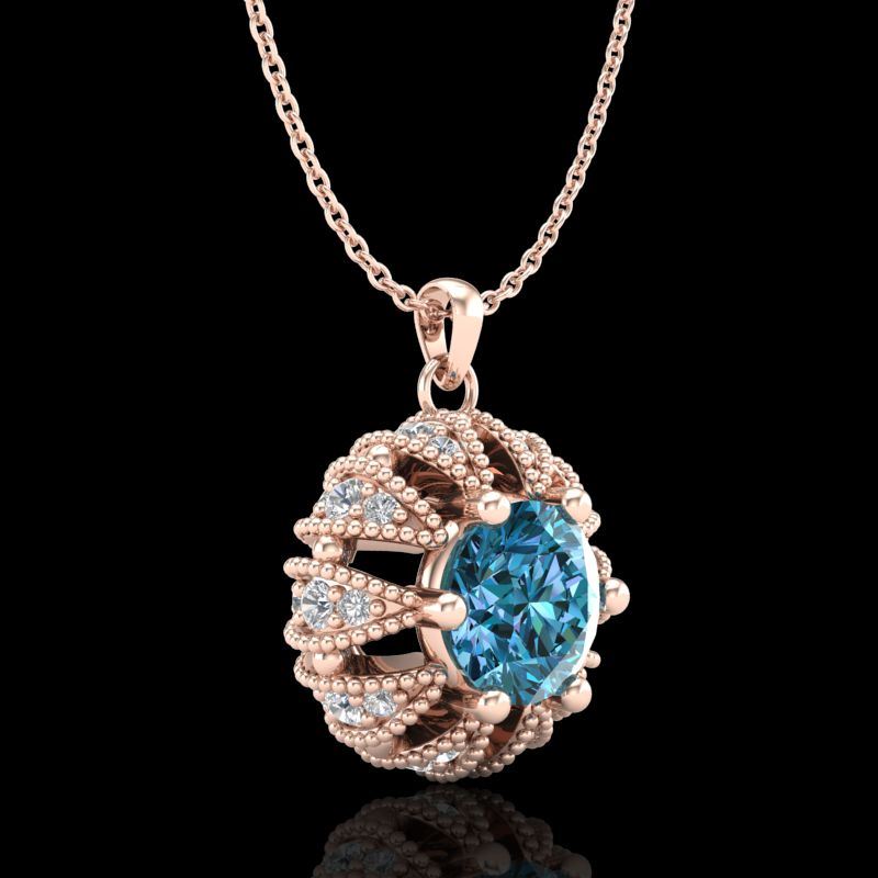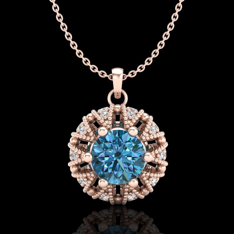 REF-118Y2K -37741 ---- 1.2 CTW Fancy Intense Blue Diamond Art Deco Stud Necklace 18K Rose Gold ---- Luxury Designer Brand NECKLACE Appraised at $7,800 Certificate Number US37741 18k Rose gold, NECKLACE Size is 16 Inches, NECKLACE measuring approx. Uniform, weighing in total approx. 4 grams. Made in the USA and is stamped 18k, Main stone 0.78 carat total weight containing 1 pieces of Intense Fancy Blue color with SI quality Round shape cut Diamond , Stone #2 0.42 carat total weight containing 30 pieces of H-I color with VS/SI quality Round shape cut Diamond