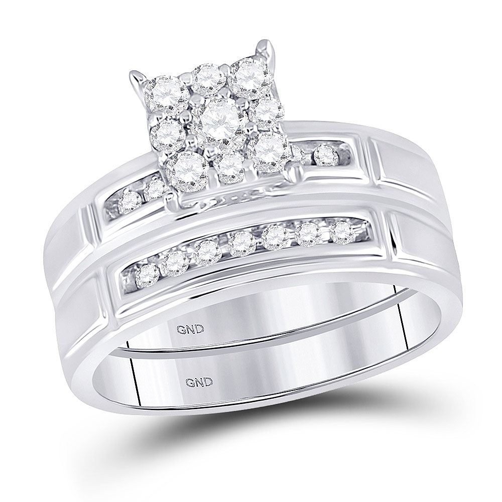 10kt White Gold His Hers Round Diamond Cluster Matching Bridal Wedding Ring Band Set 1/2 Cttw