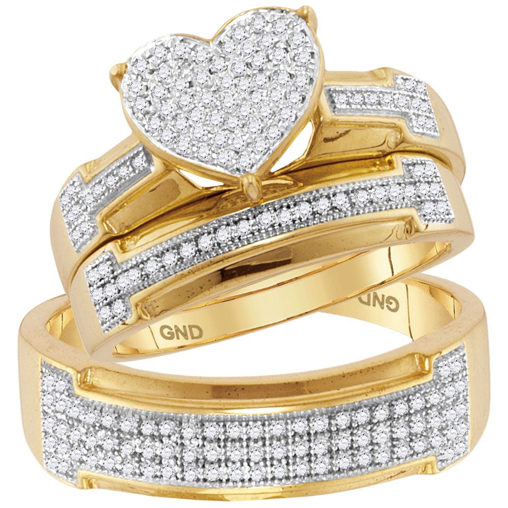 10kt Yellow Gold His & Hers Round Diamond Heart Cluster Matching Bridal Wedding Ring Band Set 1/2 Cttw