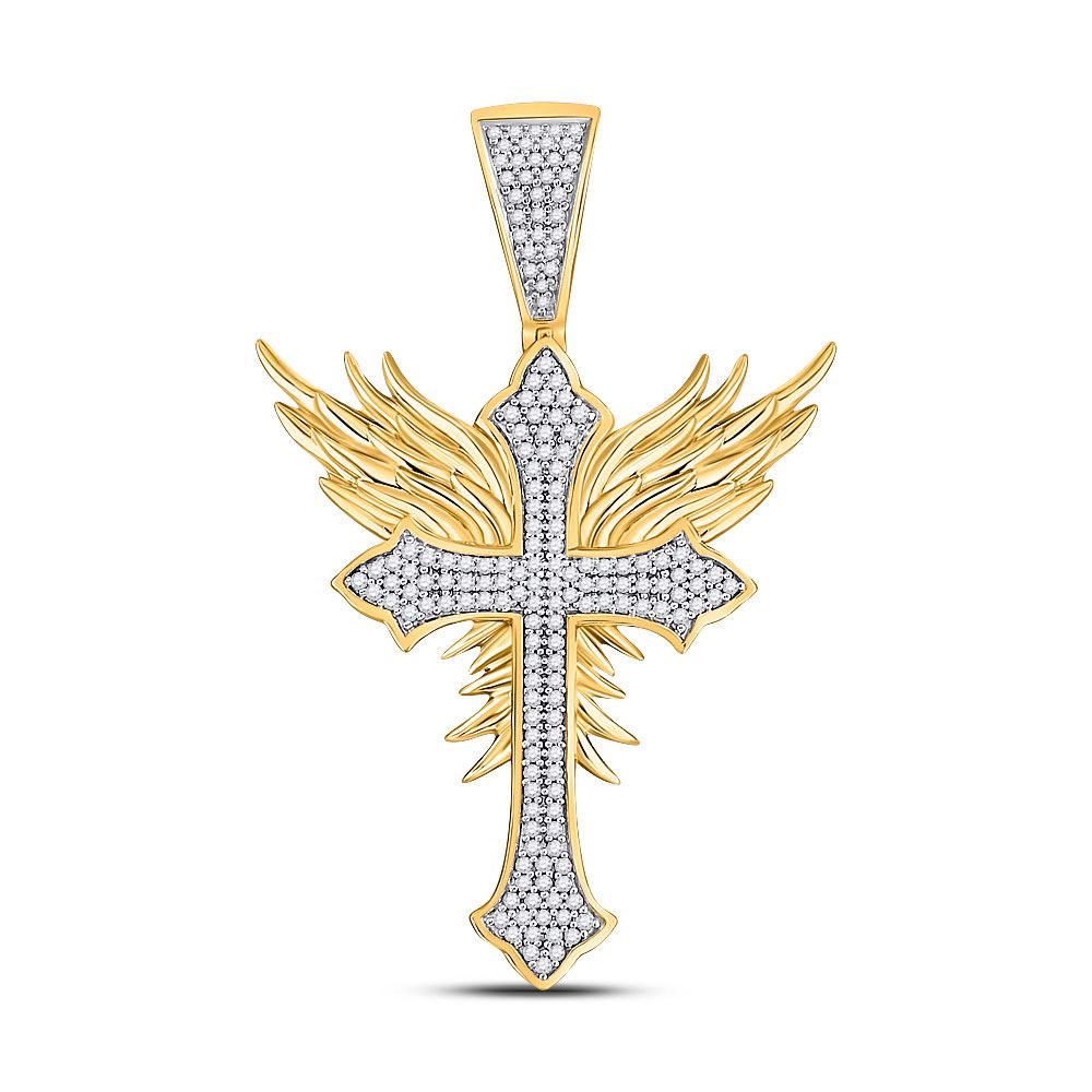 REF-61M4F - 1/2 CTW Mens Round Diamond Gothic Cross Blaze Wings Charm Pendant 10kt Yellow Gold - REF-61M4F