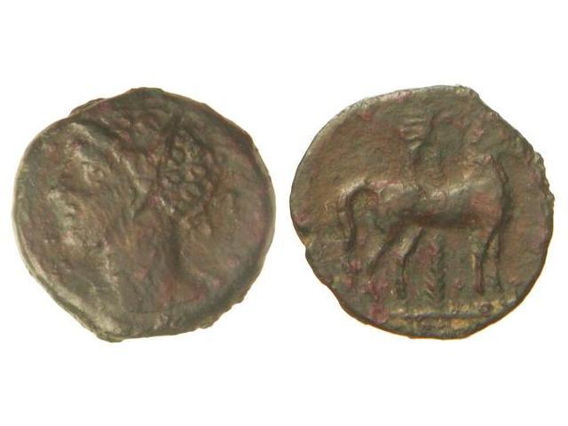 1/2 Calco. CARTAGONOVA. Anv.: Cabeza de Tanit a izquierda. Rev.: Caballo parado, detrás palmera. 2,66 grs. AB-507. MBC-.