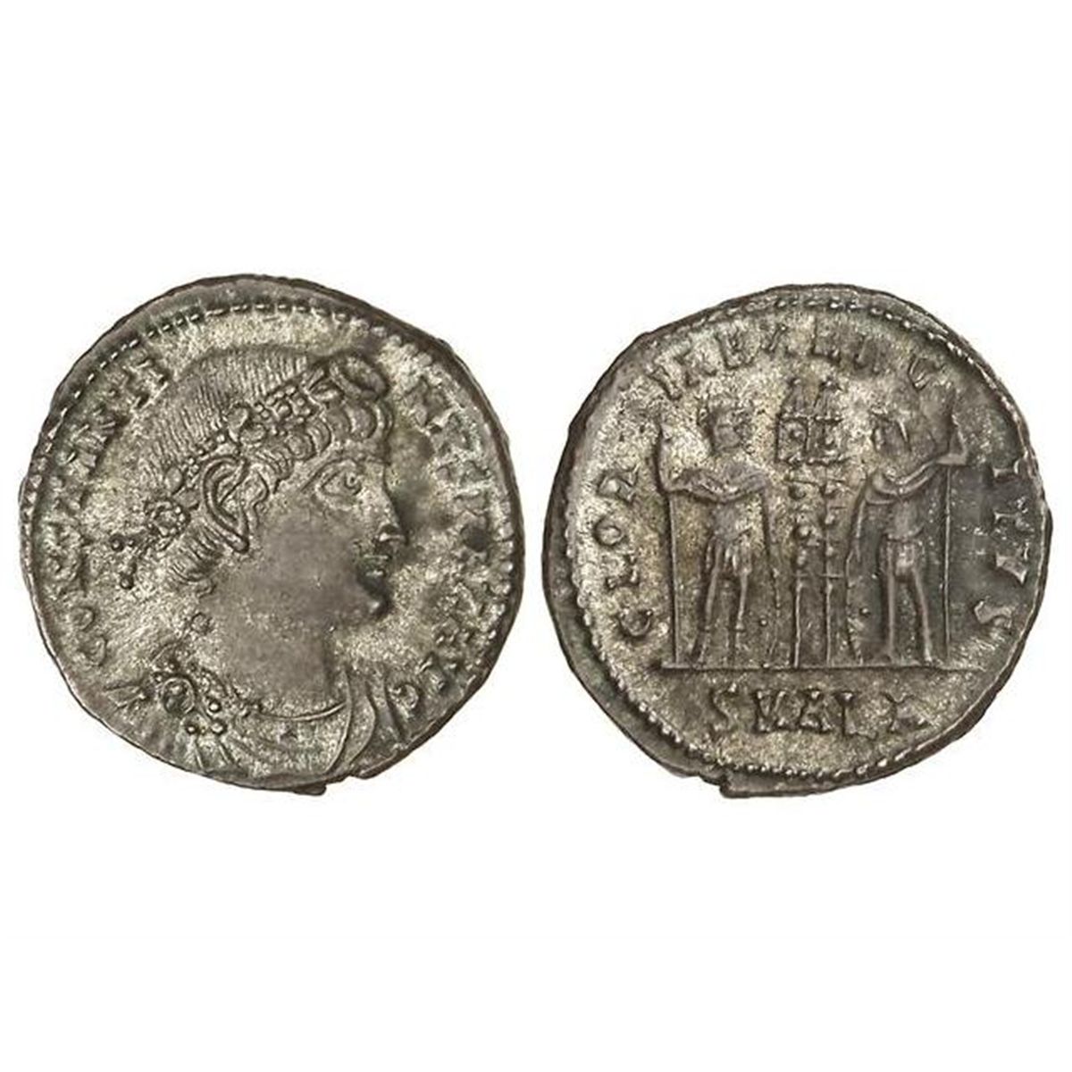 1/2 Centenional. - Acuñada el 335-337 d.C. - CONSTANTINO MAGNO. - Rev.: GLORIA EXERCITVS. En exergo: SMALA. Dos soldados, junto a sendos estandartes. Restos de plateado original. C-250. EBC+. - -