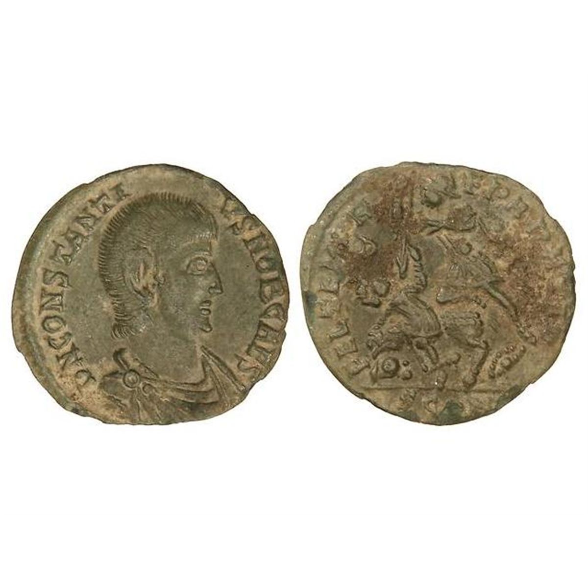1/2 Centenional. - Acuñada el 351-354 d.C. - CONSTANCIO GALO. - Rev.: FEL. TEMP. REPARATIO. SCON. Soldado en marcha a izquierda alanceando a un jinete caído. 1,70 grs. AE. Pátina verde. C-17. MBC+. - -