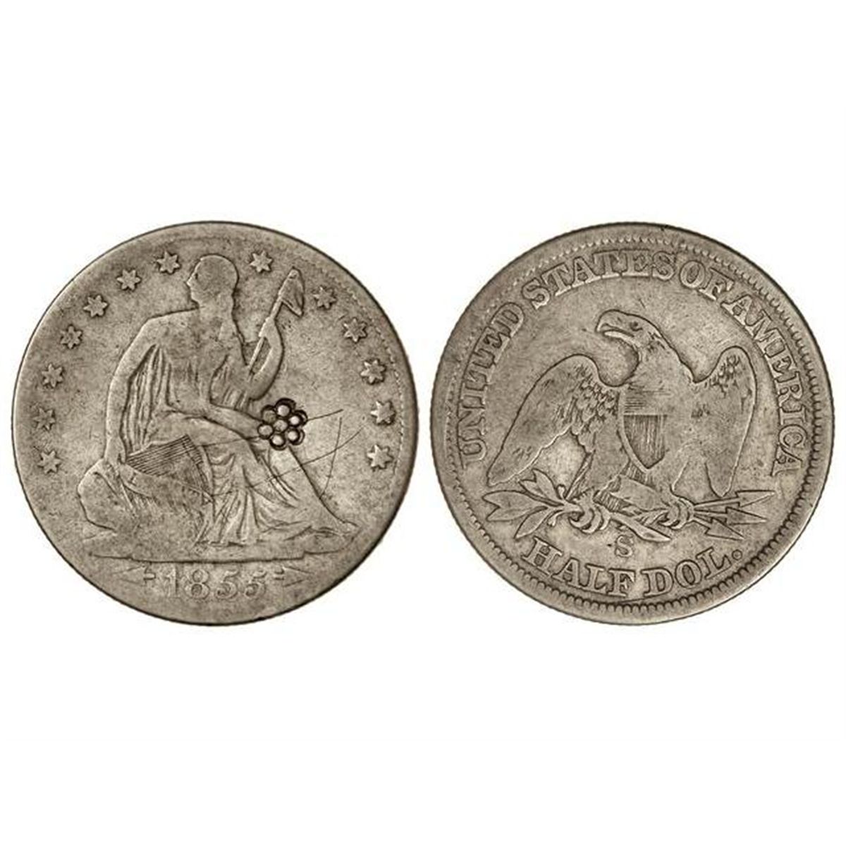 WORLD COINS: UNITED STATES - 1/2 Dólar. - 1855-S. - SAN FRANCISCO. - AR. Libertad sentada. Fecha entre flechas. Contramarca flor de seis pétalos. (Rayitas). RARA. KM-82. BC/BC+. - -